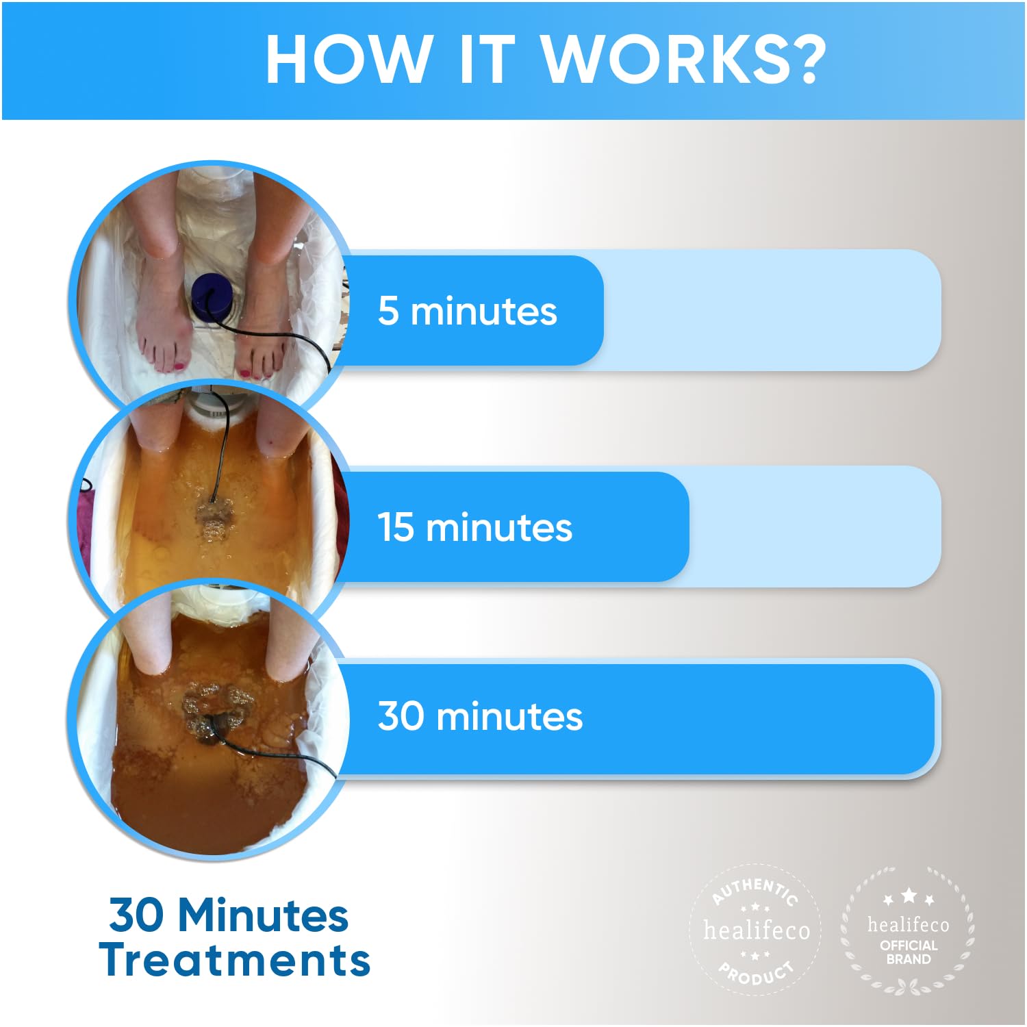 This natural treatment works by ionization. The ionizer, which is placed in the foot bath, releases ions through the water and into your body. Your cells are energized by the ions and are finally able to release the toxins, oils, acids, fats, heavy metals, cellular debris, and waste that have accumulated over your lifetime.
